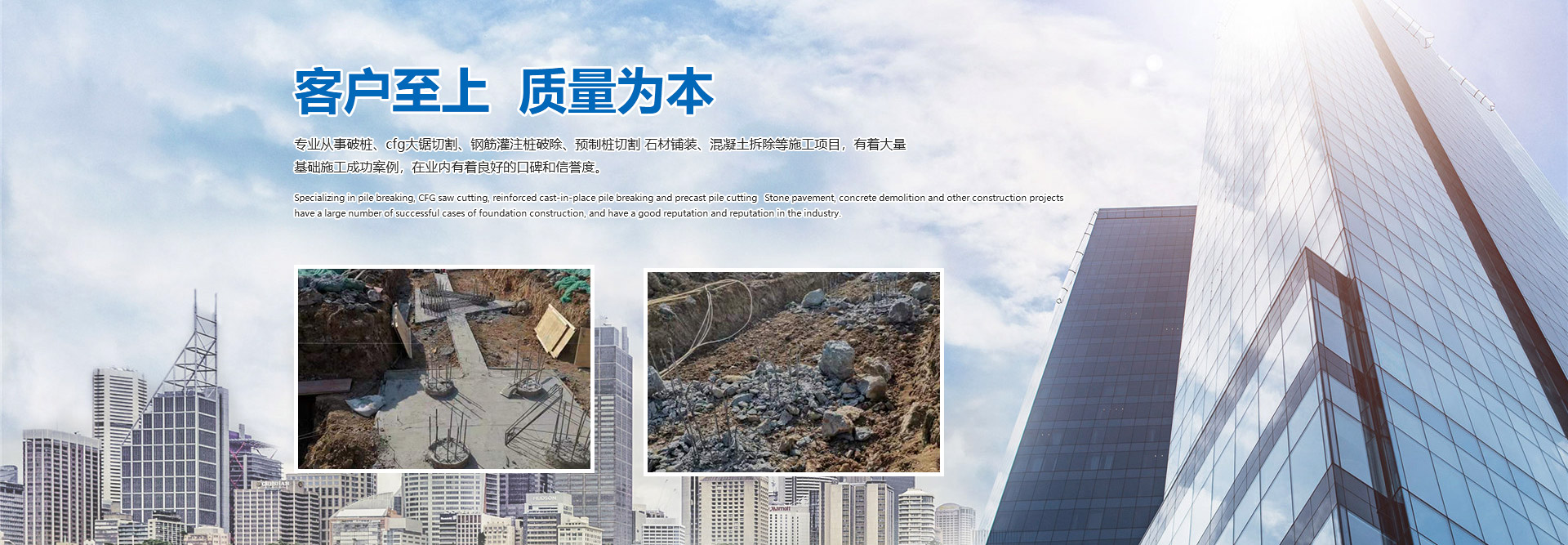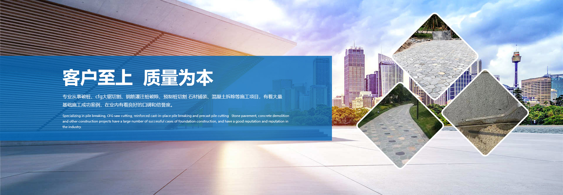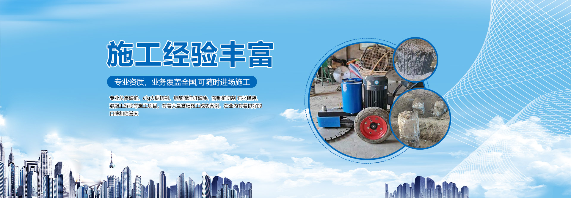 山东破桩头厂家济宁九州ku游平台有限公司是专业的破桩头施工队,施工经验丰富,价格低,规范要求,石材铺装队铺装效果好。公司坐落在美丽和谐的“孔孟之乡,礼仪之邦”的城市——山东济宁,地理位置较好,交通运输便捷,施工技术发达。专业从事破桩、cfg大锯切割、钢筋灌注桩破除、预制桩切割 石材铺装、混凝土拆除等施工项目,有着大量基础施工成功案例,在业内有着良好的口碑和信誉度。 公司本着“客户至上,质量为本”的原则,建立健全了严苛的质量标准控制体系,在安全生产的大前提下,保证客户的工程质量和工程进度。